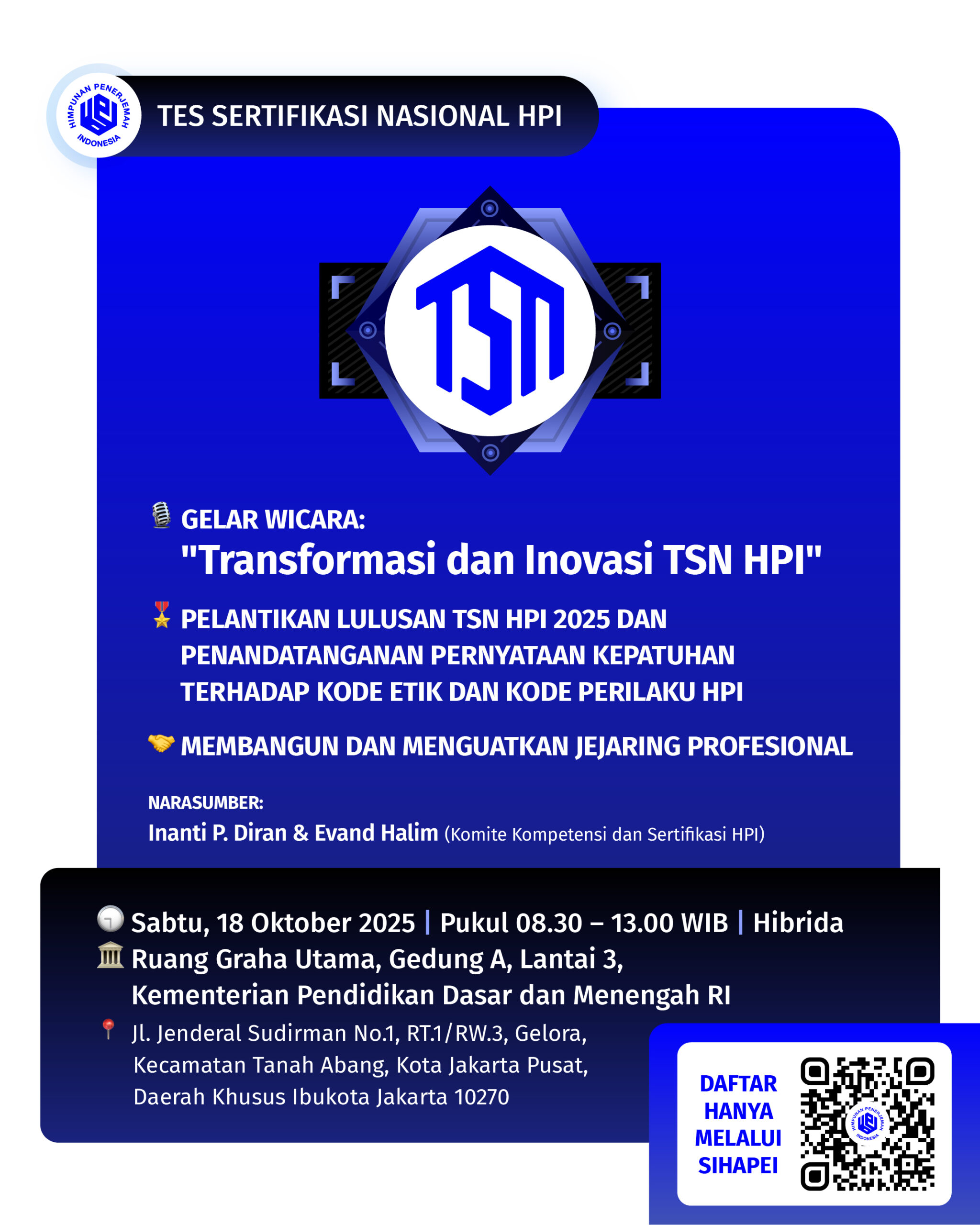 Sehubungan dengan telah diumumkannya hasil Tes Sertifikasi Nasional Himpunan Penerjemah Indonesia (TSN HPI) 2025, Badan Pengurus HPI menyelenggarakan acara "Pelantikan Lulusan TSN HPI 2025".