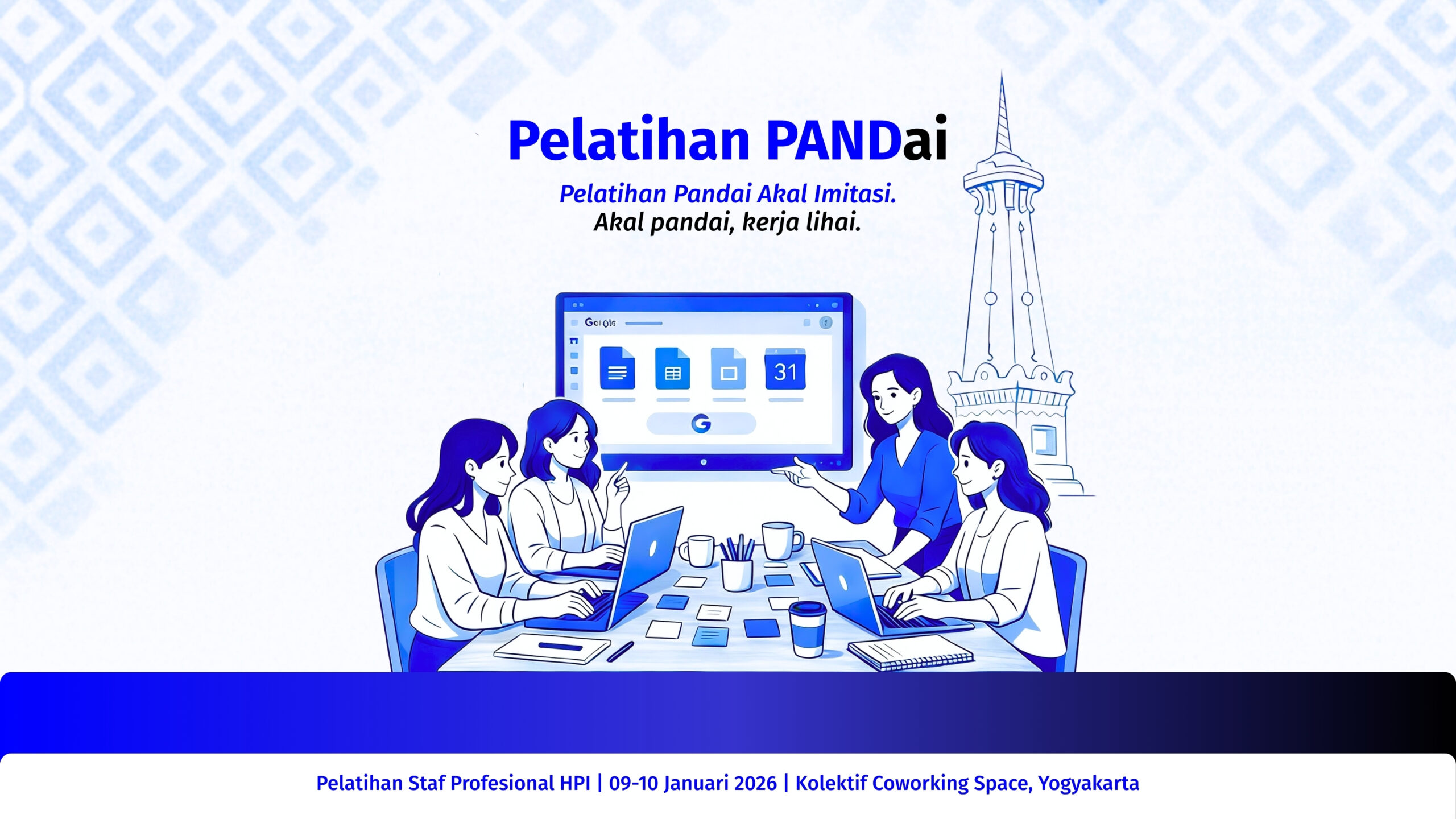 Himpunan Penerjemah Indonesia (HPI) sukses menyelenggarakan pelatihan intensif bertajuk "PANDai" (Pandai Akal Imitasi) bagi Tim Staf Profesional pada Jumat–Sabtu, 9–10 Januari 2026. Bertempat di Kolektif Coworking Space, Yogyakarta, kegiatan ini dihadiri oleh Sekretaris Umum, empat staf profesional, dan didampingi oleh Wakil Ketua HPI Bidang Kerja 1 secara luring. Pelatihan ini dirancang untuk mentransformasi pola pikir kerja dari kebiasaan individual menuju sistem organisasi yang terpadu, dengan menempatkan teknologi akal imitasi (AI) sebagai "kopilot" guna meningkatkan efektivitas, keamanan, dan kualitas pelayanan bagi seluruh anggota.