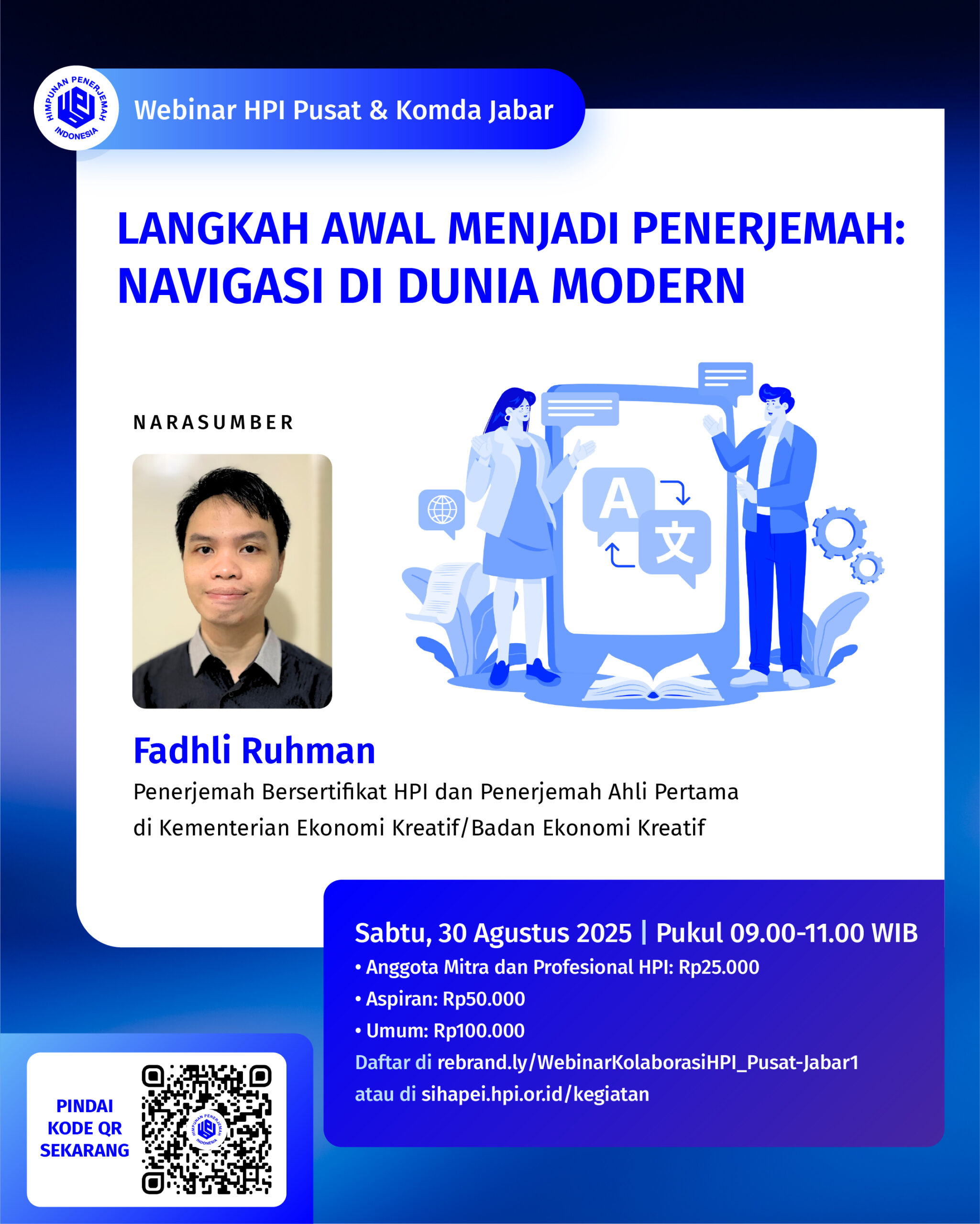 Webinar Kolaborasi HPI Pusat dan HPI Komda Jawa Barat bertajuk "Langkah Awal Menjadi Penerjemah: Navigasi di Dunia Modern" diselenggarakan pada Sabtu, 30 Agustus 2025, pukul 09.00-11.00 WIB di dalam ruang Zoom. Divisi Pengembangan Profesi HPI Pusat dan Komda Sulsel menghadirkan Fadhli Ruhman (Penerjemah Bersertifikat HPI dan Penerjemah Ahli Pertama di Kementerian Ekonomi Kreatif/Badan Ekonomi Kreatif) sebagai narasumber.