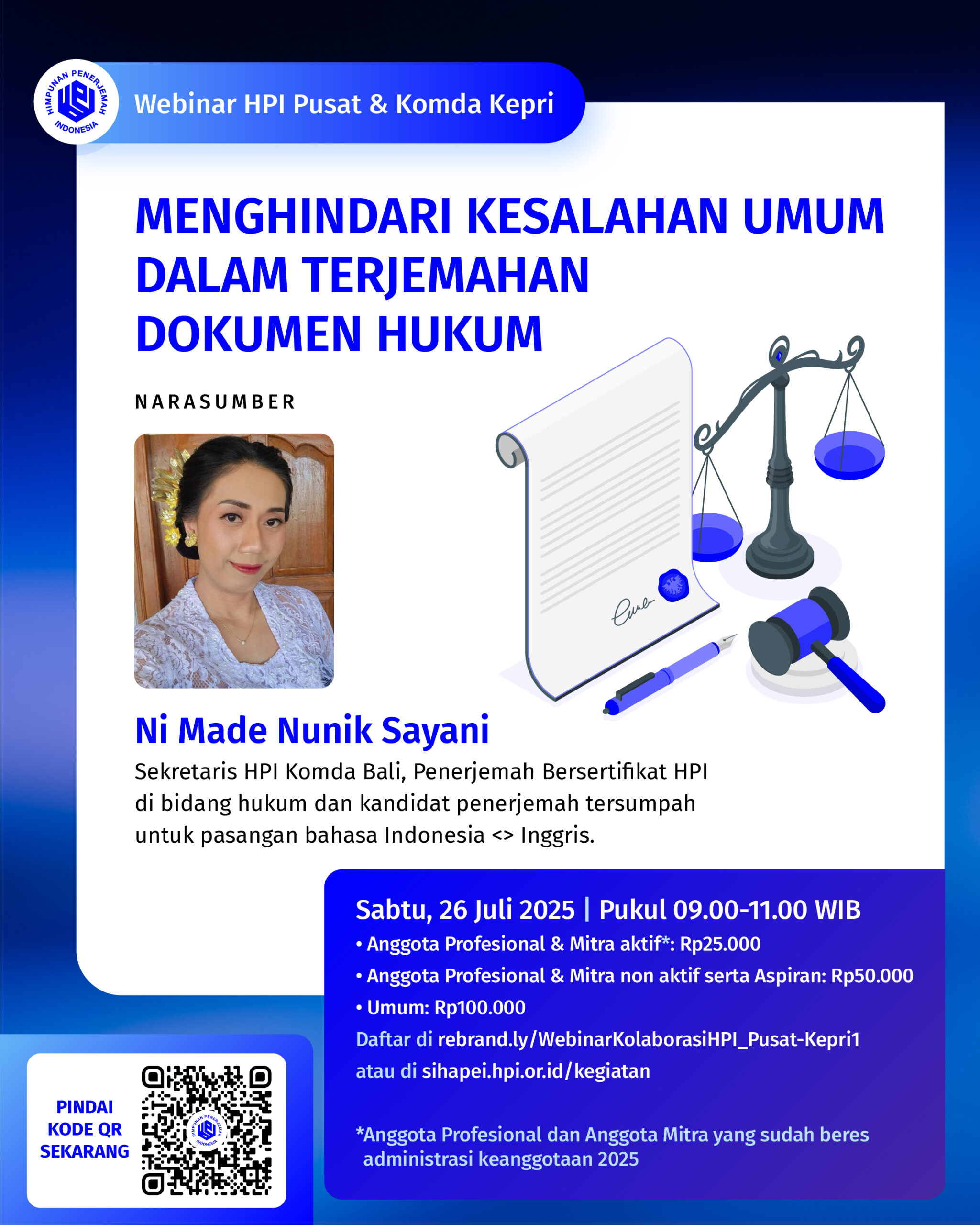 Webinar Kolaborasi HPI Pusat dan HPI Komda Kepulauan Riau bertajuk "Menghindari Kesalahan Umum dalam Terjemahan Dokumen Hukum" diselenggarakan pada Sabtu, 26 Juli 2025 pukul 09.00 - 11.00 WIB di dalam ruang Zoom. Divisi Pengembangan Profesi HPI Pusat dan Komda Kepri menghadirkan Ni Made Nunik Sayani (Sekretaris HPI Komda Bali, Penerjemah Bersertifikat HPI di bidang hukum dan kandidat penerjemah tersumpah untuk pasangan bahasa Indonesia<>Inggris) sebagai narasumber.